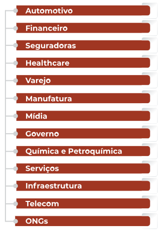 Como resultado da qualidade de nossos serviços, tivemos a oportunidade de atender clientes nacionais e multinacionais de médio e grande porte, distribuidos nos seguintes segmentos: